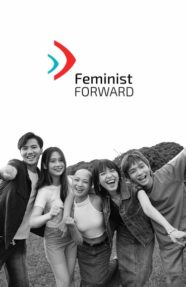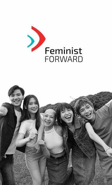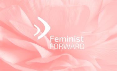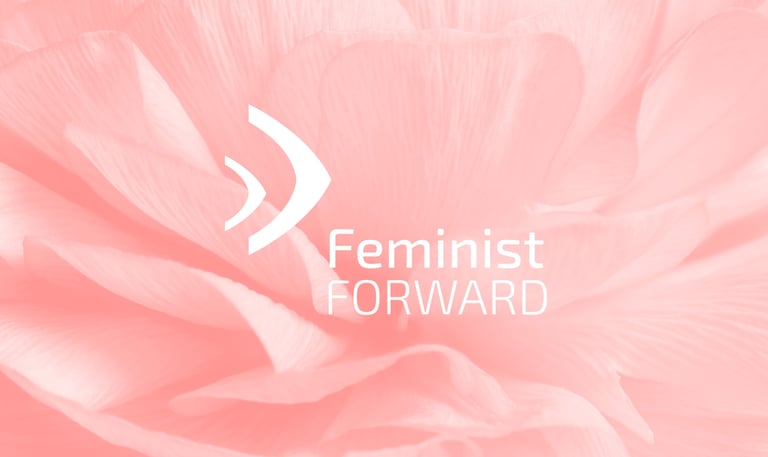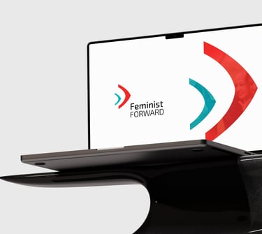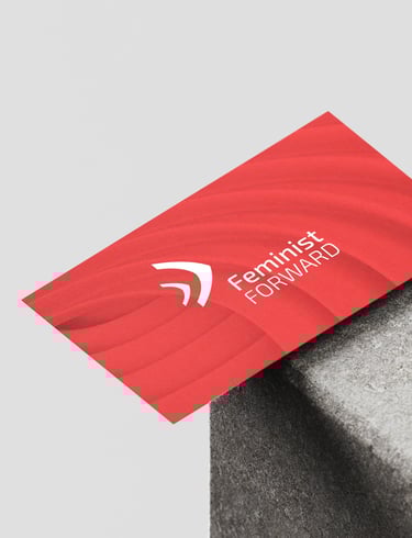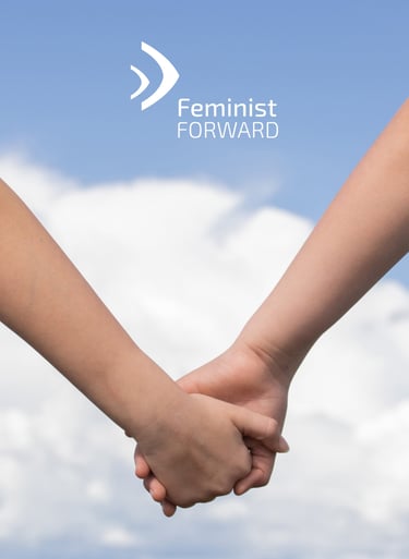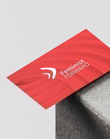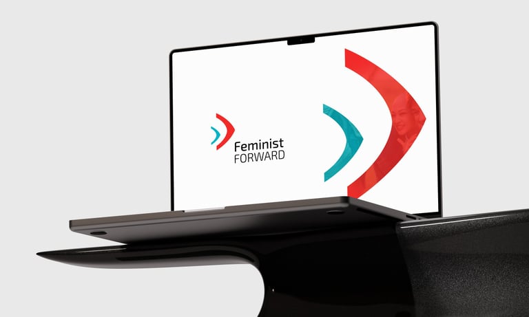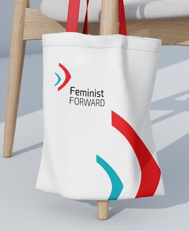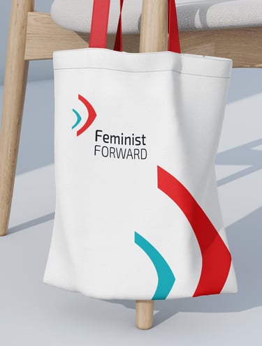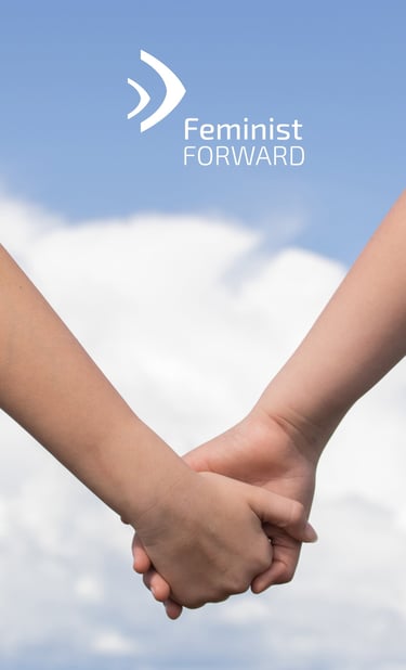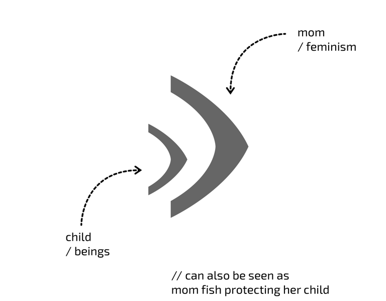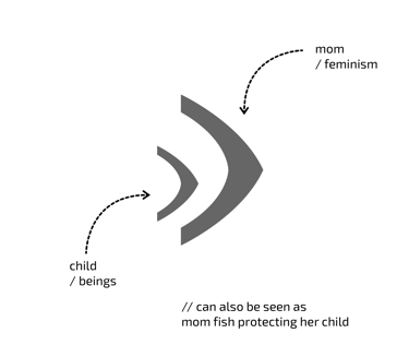 The abstract shape resembles a mother and child or a protective form, symbolizing feminism’s role in safeguarding marginalized communities. It also evokes movement — a forward momentum of collective action.
