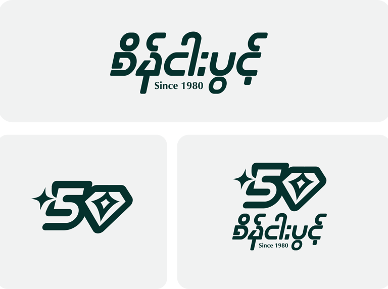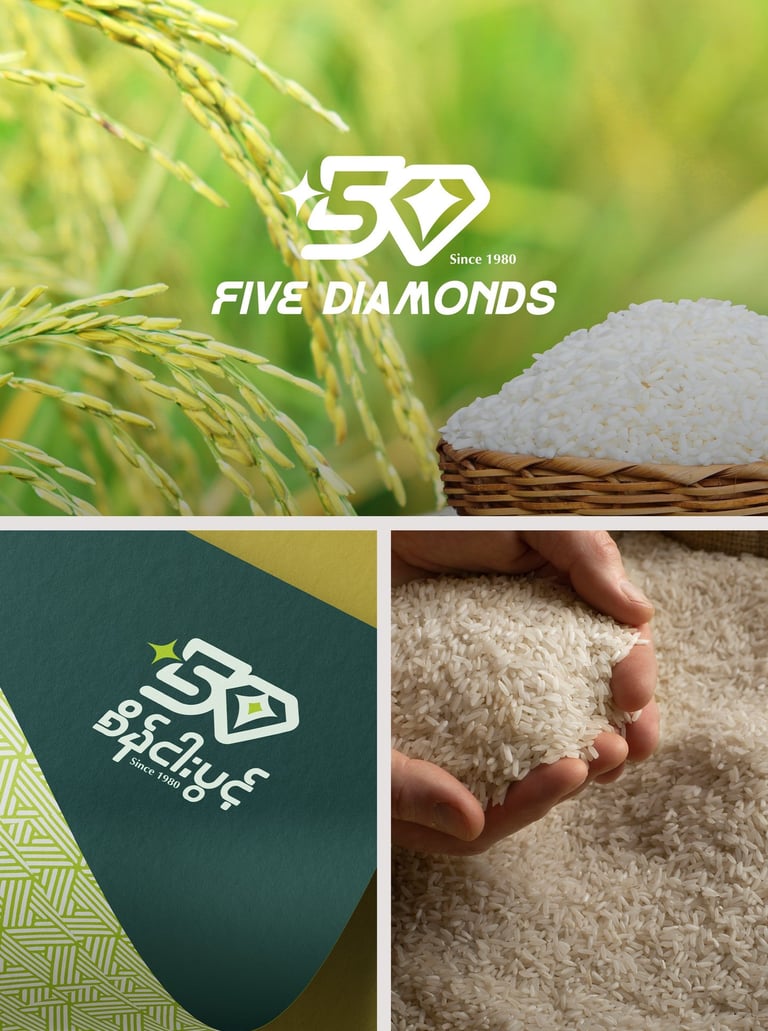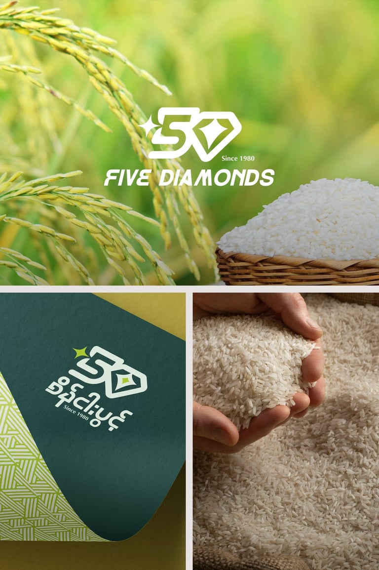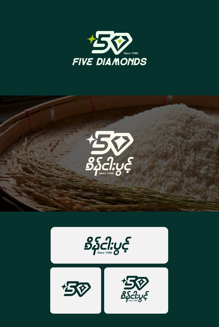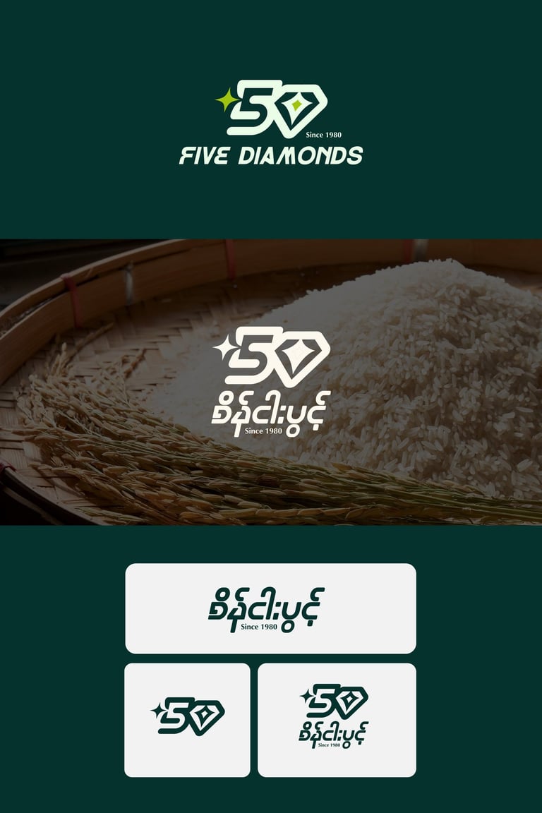 Concept: ဒီconceptမှာ စိန်ပွင့်ပုံစံလေးကို ယူသုံးထားတာကတော့ "စိန်ငါးပွင့်" ဆိုတဲ့ နာမည်ကို ရည်ညွှန်းချင်လို့ပါ။ ဒီဇိုင်းမှာ တောက်ပနေတဲ့ ပုံစံလေး သုံးထားတာက သန့်စင်မှု၊ သေသပ်မှုနဲ့ အဆင့်မြင့် စိုက်ပျိုးရေးထုတ်ကုန်ဖြစ်ကြောင်း သိမ်သိမ်မွေ့မွေ့လေး ဖော်ပြနေပါတယ်။ ဒီ Logo concept ကို စိုက်ပျိုးရေးအငွေ့အသက်ကို မပျောက်ပျက်စေဘဲ ခေတ်မှီတဲ့ပုံစံကိုပါ ခံစားမိအောင် ဖန်တီးပေးထားပါတယ်။