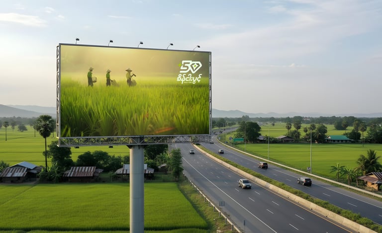တောက်ပတဲ့ အစိမ်းရောင် (Vibrant Green): တိုးတက်ကြီးပွားမှု၊ ဆန်စပါးစိုက်ပျိုးမှုနဲ့ စိုက်ပျိုးရေးရဲ့ ရှင်သန်နိုးကြားမှုကို ပြသပါတယ်။