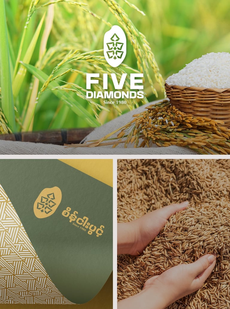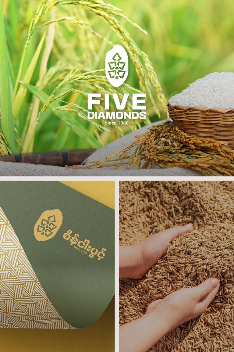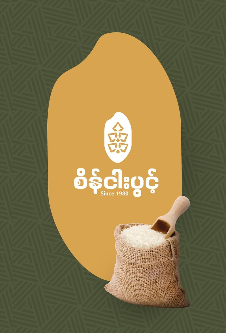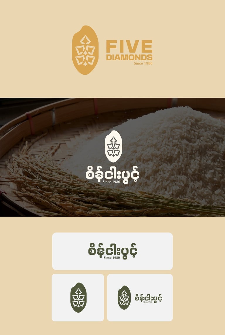 ဒီ Concept ကို Brand ရဲ့ အခြေခံအကျဆုံးသင်္ကေတဖြစ်တဲ့ ဆန်စေ့ပုံစံလေးကို အခြေခံပြီး အကောင်အထည်ဖော်ထားပါတယ်။ ဆန်စေ့ပုံစံထဲမှာမှ စပါးနှံအခက် Pattern လေး ကို ထည့်သွင်းဖန်တီးထားပါတယ်။ ဒီ Concept ကတော့ သဘာဝ၊ ယဉ်ကျေးမှုနဲ့ စိုက်ပျိုးရေး ဆိုတဲ့ အဓိကအချက်သုံးခုကို သေသပ်စွာ ချိတ်ဆက်ပေးပြီး၊ ရွှေဘိုဆန်ရဲ့ အမွေအနှစ်ကို ကိုယ်စားပြုနိုင်တဲ့ Brand Identity တစ်ခု ဖြစ်စေပါတယ်။