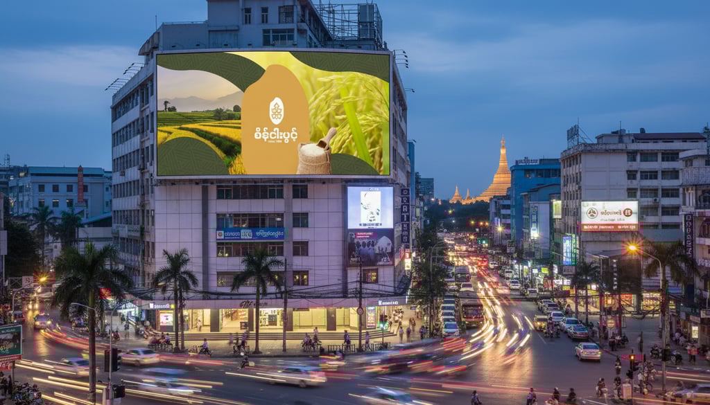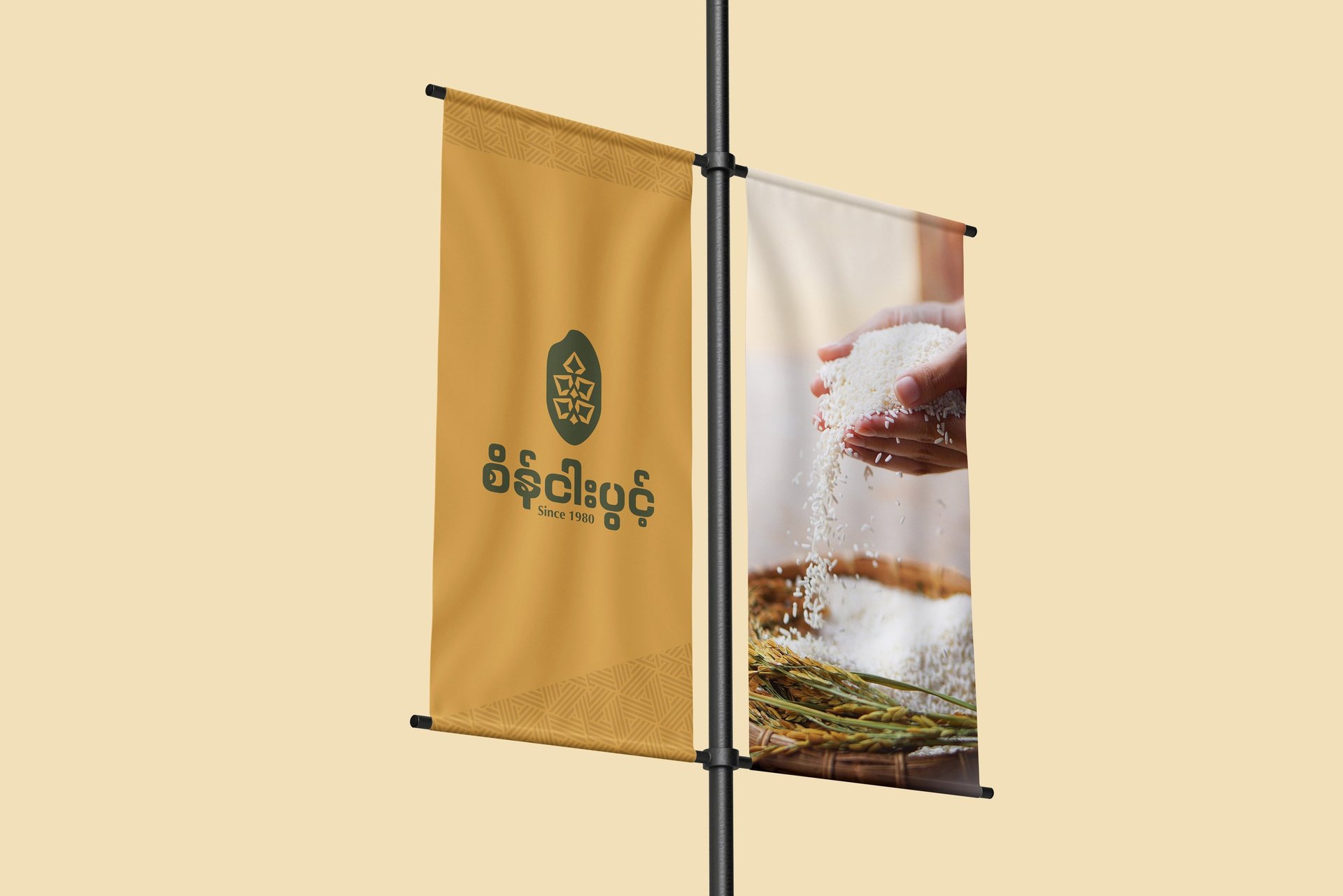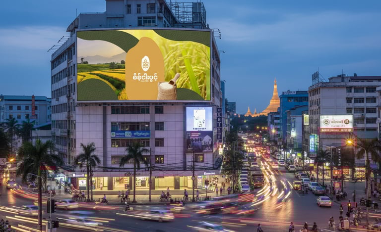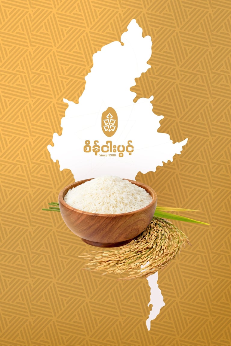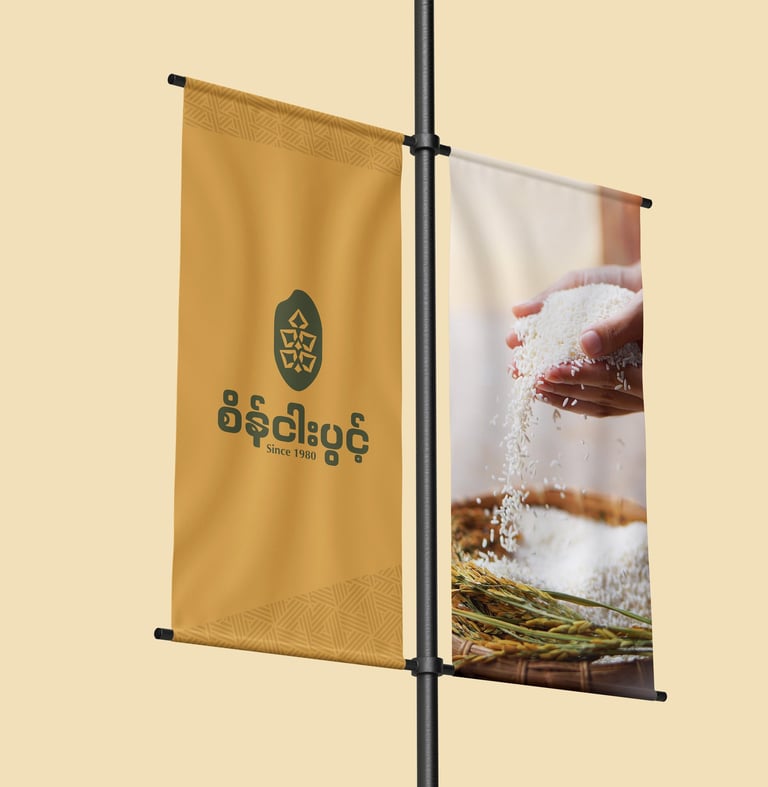 ဒီ Concept ကို Brand ရဲ့ အခြေခံအကျဆုံးသင်္ကေတဖြစ်တဲ့ ဆန်စေ့ပုံစံလေးကို အခြေခံပြီး အကောင်အထည်ဖော်ထားပါတယ်။ ဆန်စေ့ပုံစံထဲမှာမှ စပါးနှံအခက် Pattern လေး ကို ထည့်သွင်းဖန်တီးထားပါတယ်။ ဒီ Concept ကတော့ သဘာဝ၊ ယဉ်ကျေးမှုနဲ့ စိုက်ပျိုးရေး ဆိုတဲ့ အဓိကအချက်သုံးခုကို သေသပ်စွာ ချိတ်ဆက်ပေးပြီး၊ ရွှေဘိုဆန်ရဲ့ အမွေအနှစ်ကို ကိုယ်စားပြုနိုင်တဲ့ Brand Identity တစ်ခု ဖြစ်စေပါတယ်။