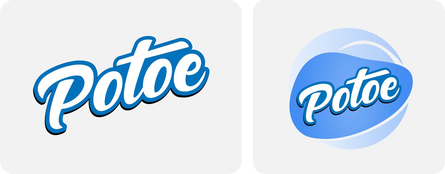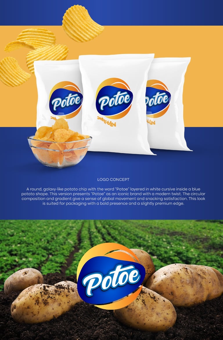 Concept 1: A round, galaxy-like potato chip with the word “Potoe” layered in white cursive inside a blue potato shape.