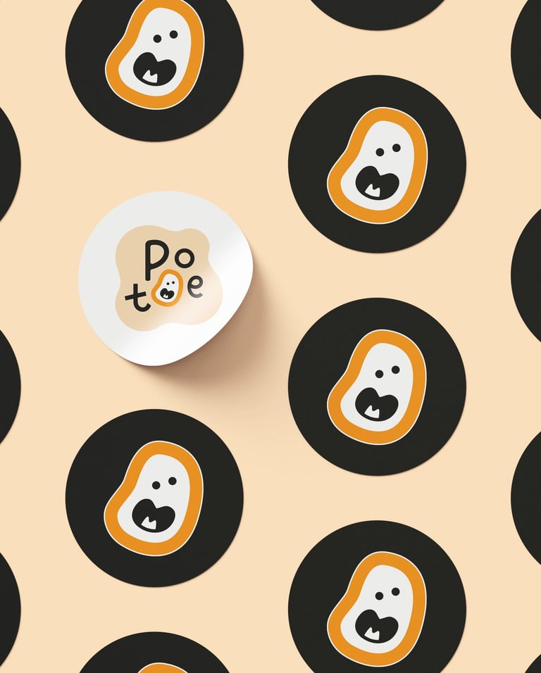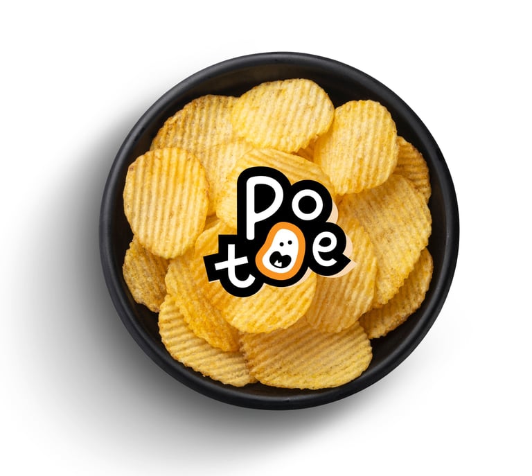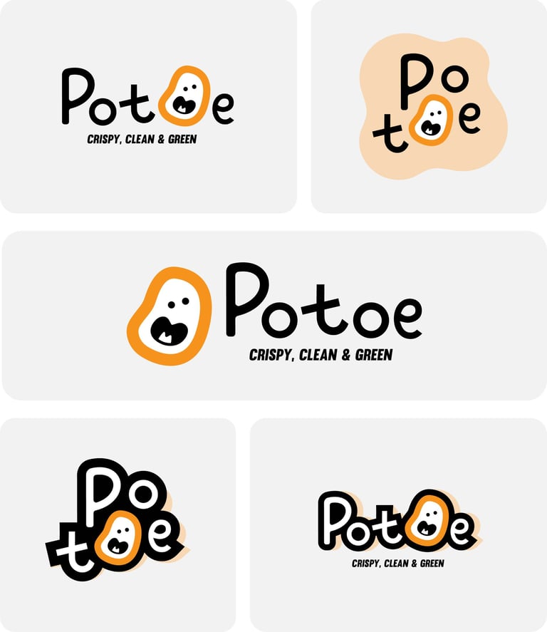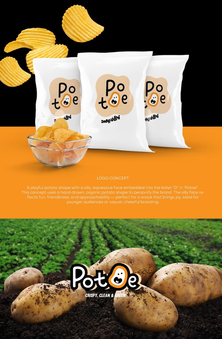 This concept uses a hand-drawn, organic potato shape to personify the brand. The silly face reflects fun, friendliness, and approachability — perfect for a snack that brings joy. Ideal for younger audiences or casual, cheerful branding.